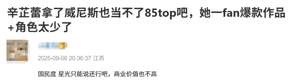 开始是说她咖位不如85花,威尼斯电影节奖项缩水之类的。