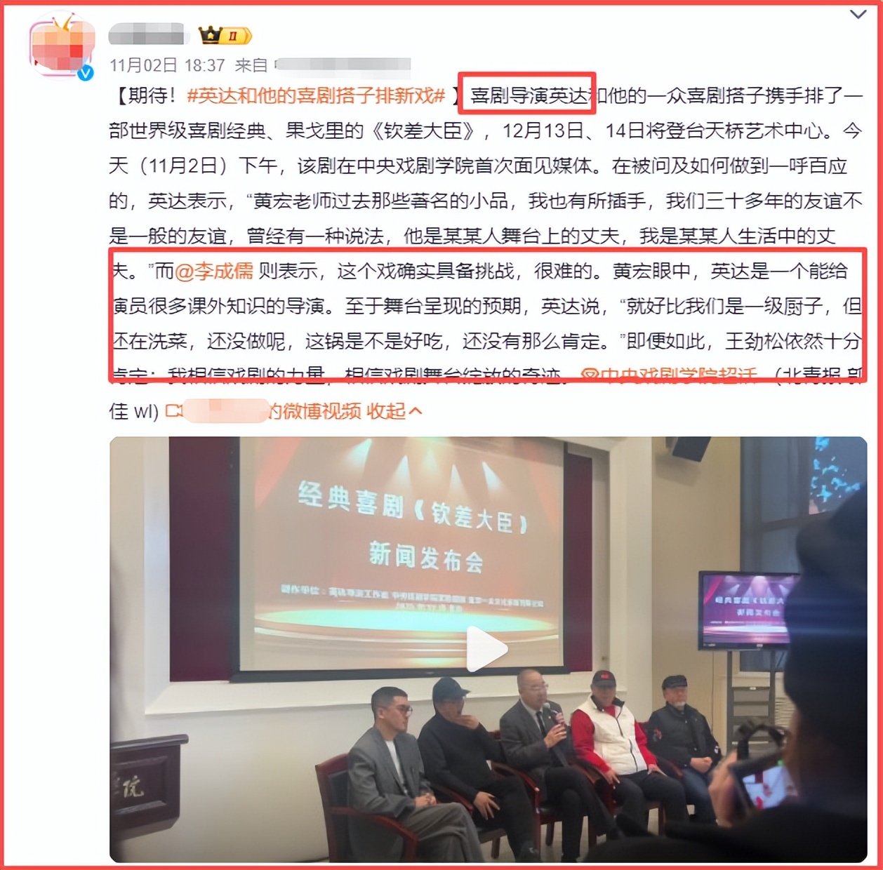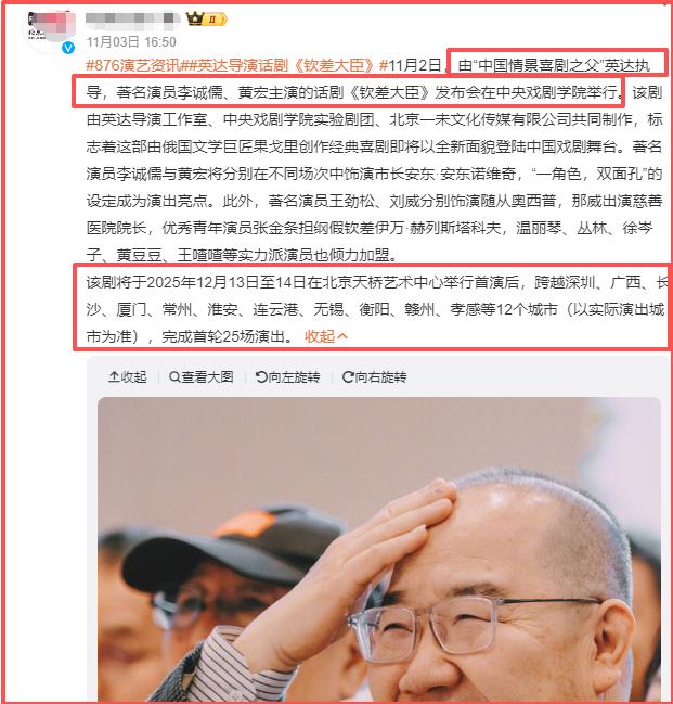 中央戏剧学院不仅为《钦差大臣》站台,副院长徐贞还赞其让经典照进当代,李诚儒在采访中直言英达对喜剧节奏的把控,业内没几人能比。